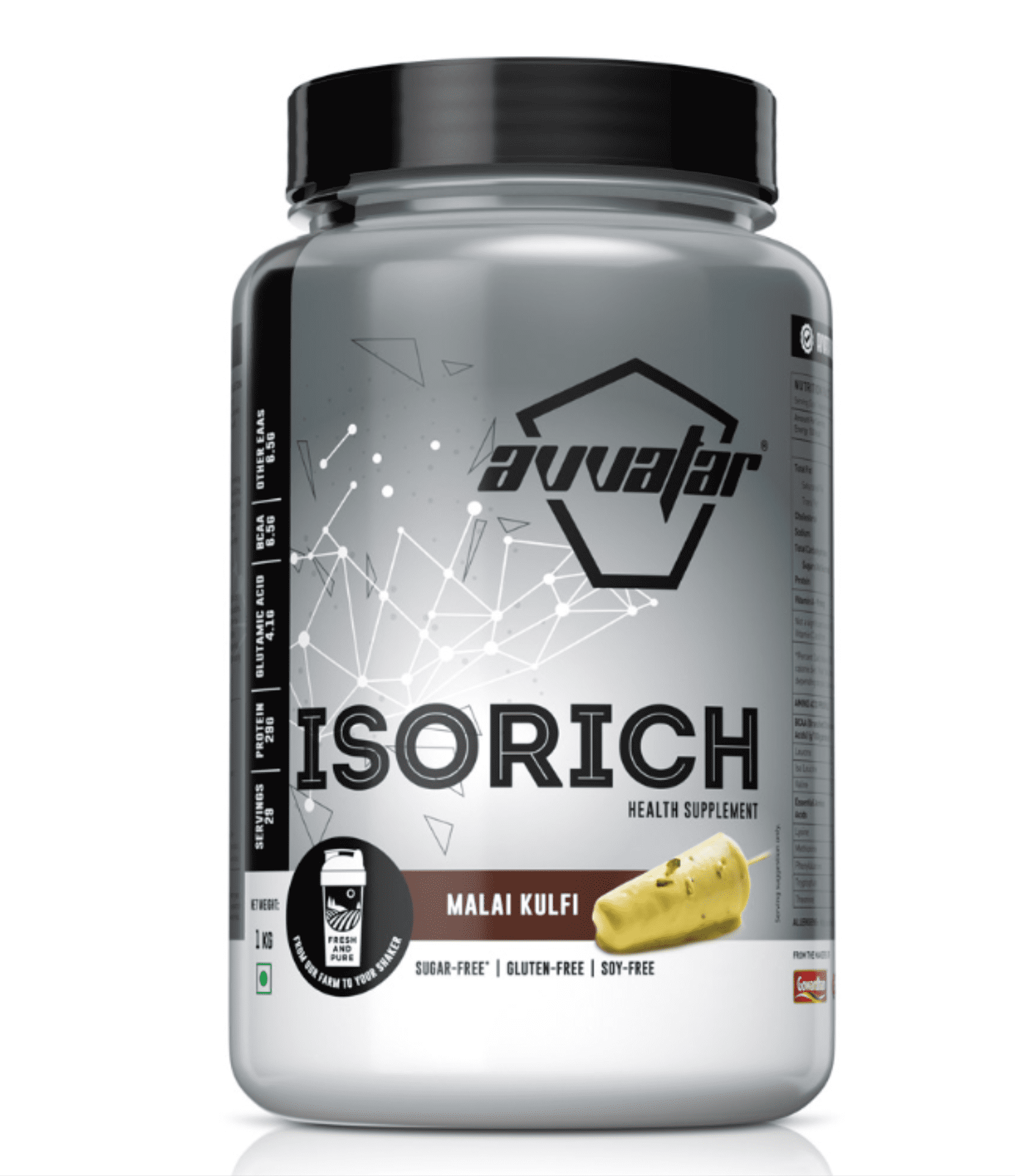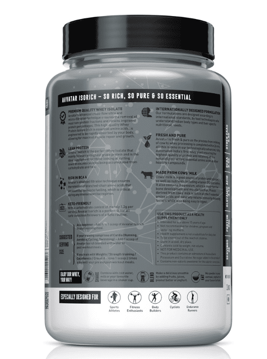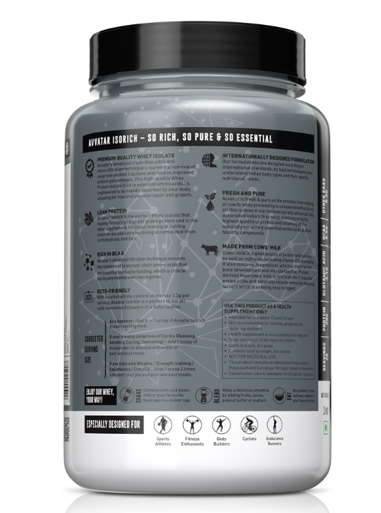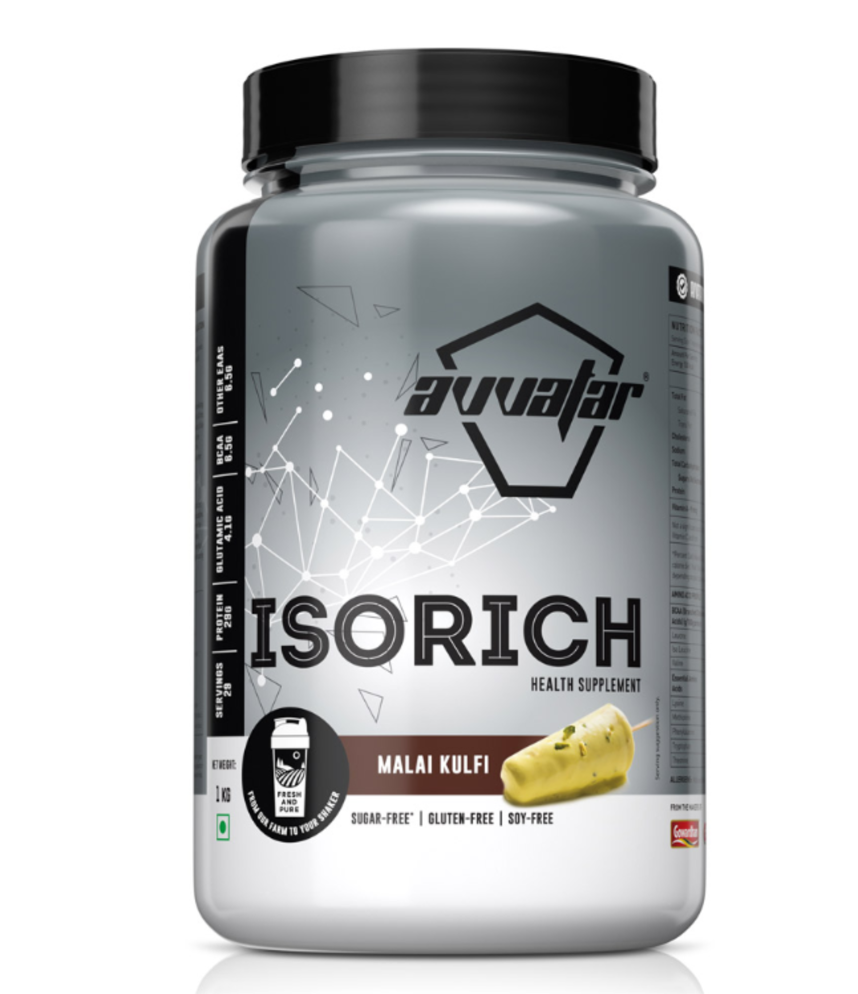 Avvatar Isorich Protein is packed with 29 GMS protein per scoop. The primary source is whey protein isolate which is loaded with health-boosting bioactive compounds along with natural phospholipids for quick recovery and sustained results!