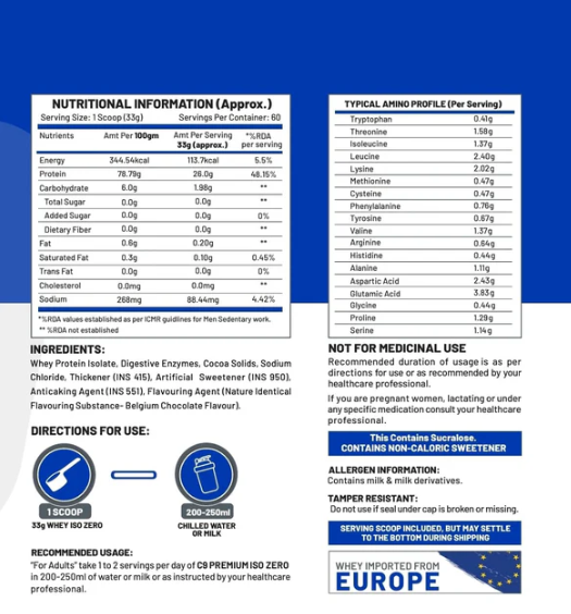 Fuel your fitness goals with C9 Nutrition ISO ZERO Whey Isolate, a premium vegetarian protein powder designed for those who demand the best. With 26g of whey protein isolate per serving, it supports muscle recovery and lean muscle development, making it perfect for fitness enthusiasts and athletes.
