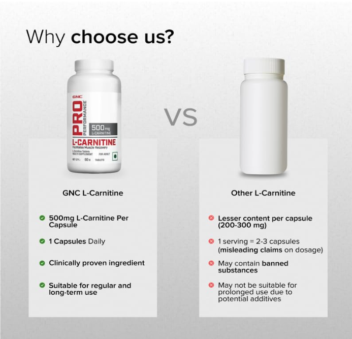 GNC L-Carnitine Tablets deliver 500 mg of high-quality L-Carnitine per serving to help your body convert fat into energy efficiently. L-Carnitine plays a vital role in transporting fatty acids into the mitochondria, where they are burned for energy — making it an essential supplement for fat metabolism, endurance, and muscle recovery.