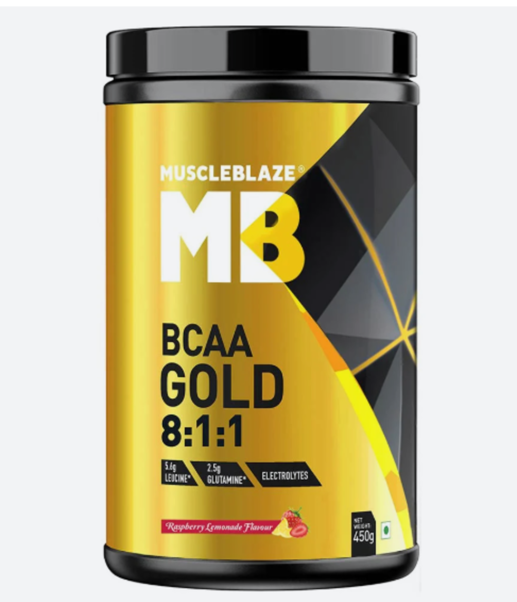 MuscleBlaze BCAA Gold is a breakthrough intra-workout fuel with an 8:1:1 ratio of branched chain amino acids including Leucine, Isoleucine, and Valine respectively. The common BCAA ratio found in regular intra-workout supplements is 2:1:1 with 2 parts of leucine over 1 part each for the other two BCAAs.