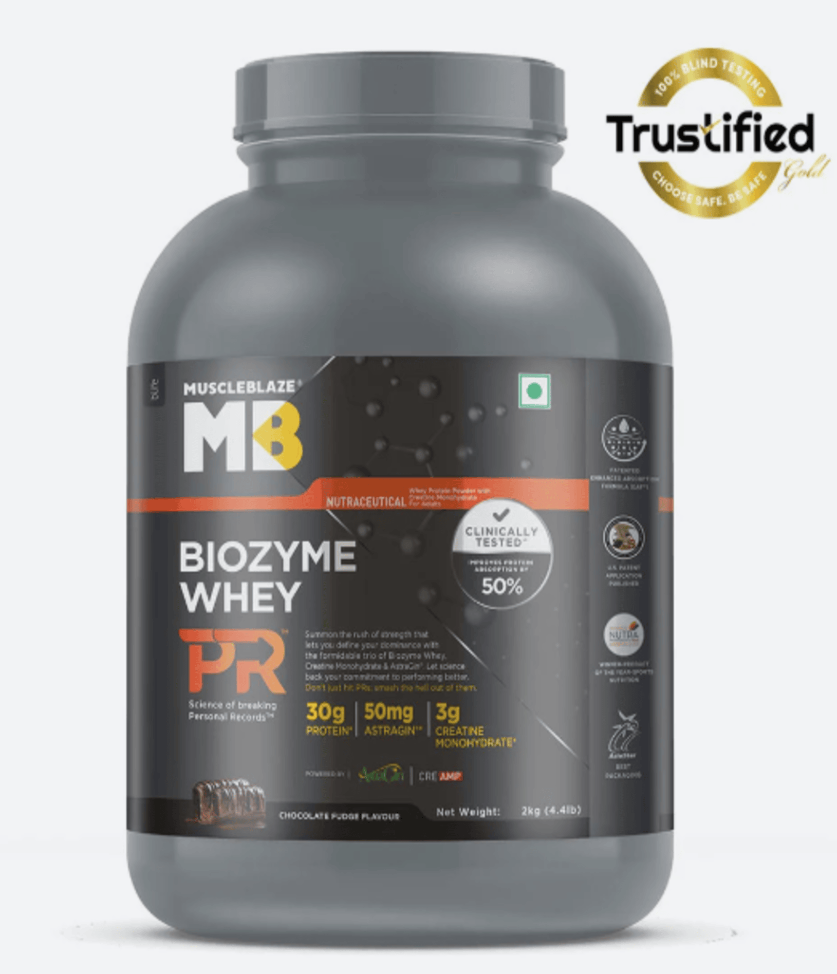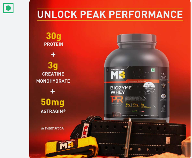 MuscleBlaze Biozyme Whey PR is crafted exclusively for fitness and muscle-building champions who want their protein supplement to be as powerful as their performance. Scientifically designed with a powerful trio of Biozyme Whey, Creatine Monohydrate, and AstraGin®, it helps you perform better and push past your personal bests.